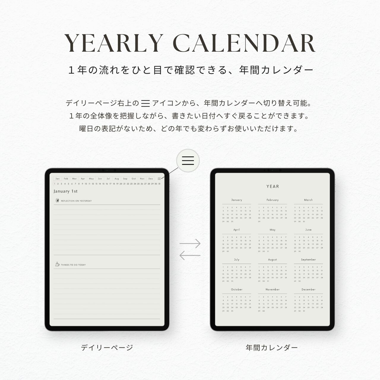 ・曜日の記載がないデザインのため、どの年でも変わらずお使いいただけます。