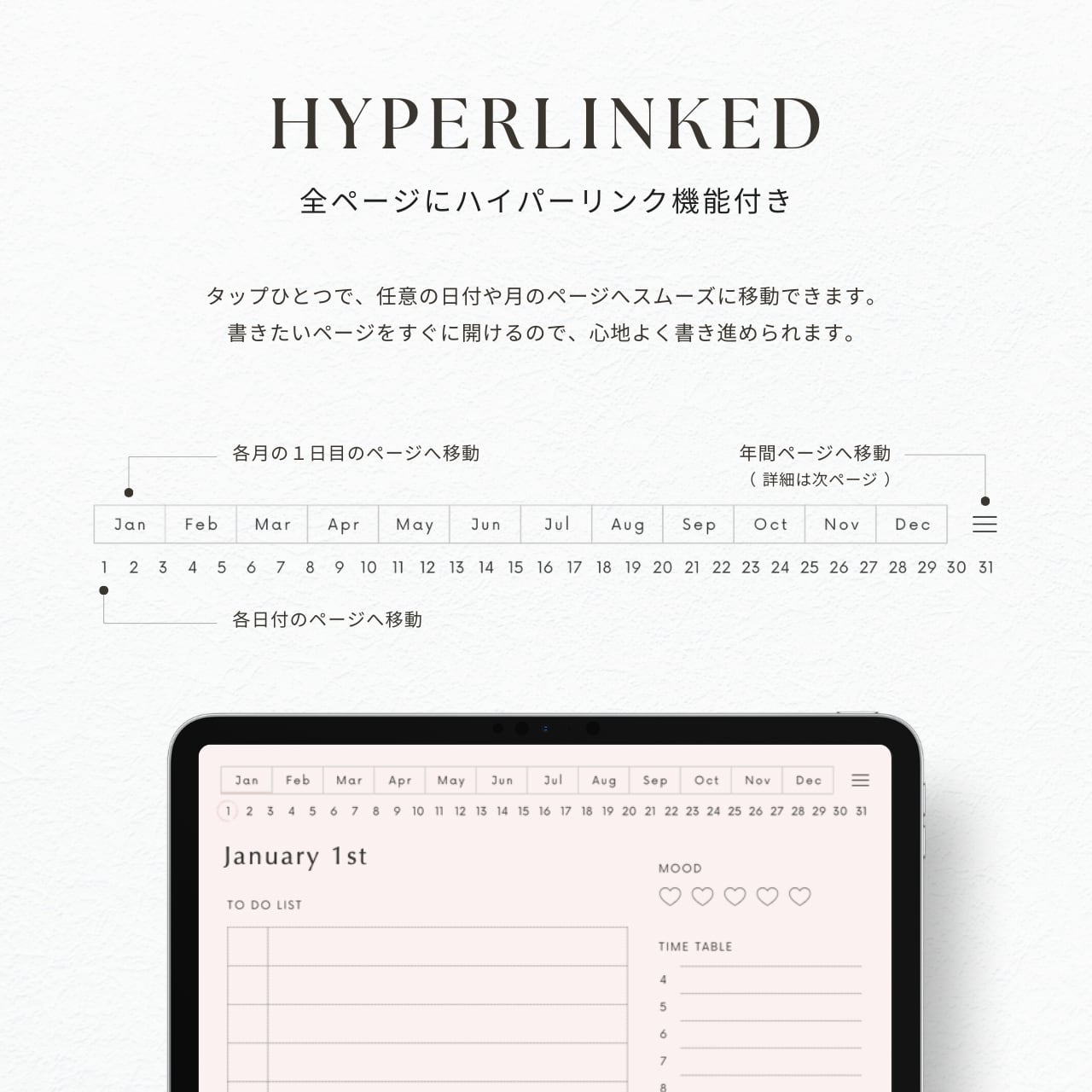 ・書きたい日付にすぐ移動できる、便利なハイパーリンク付きです。
