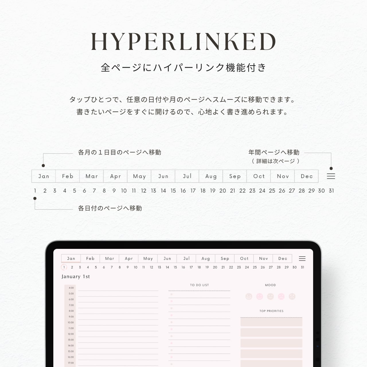 ・書きたい日付にすぐ移動できる、便利なハイパーリンク付きです。