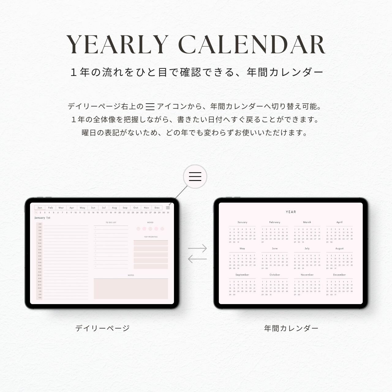 ・曜日の記載がないデザインのため、どの年でも変わらずお使いいただけます。