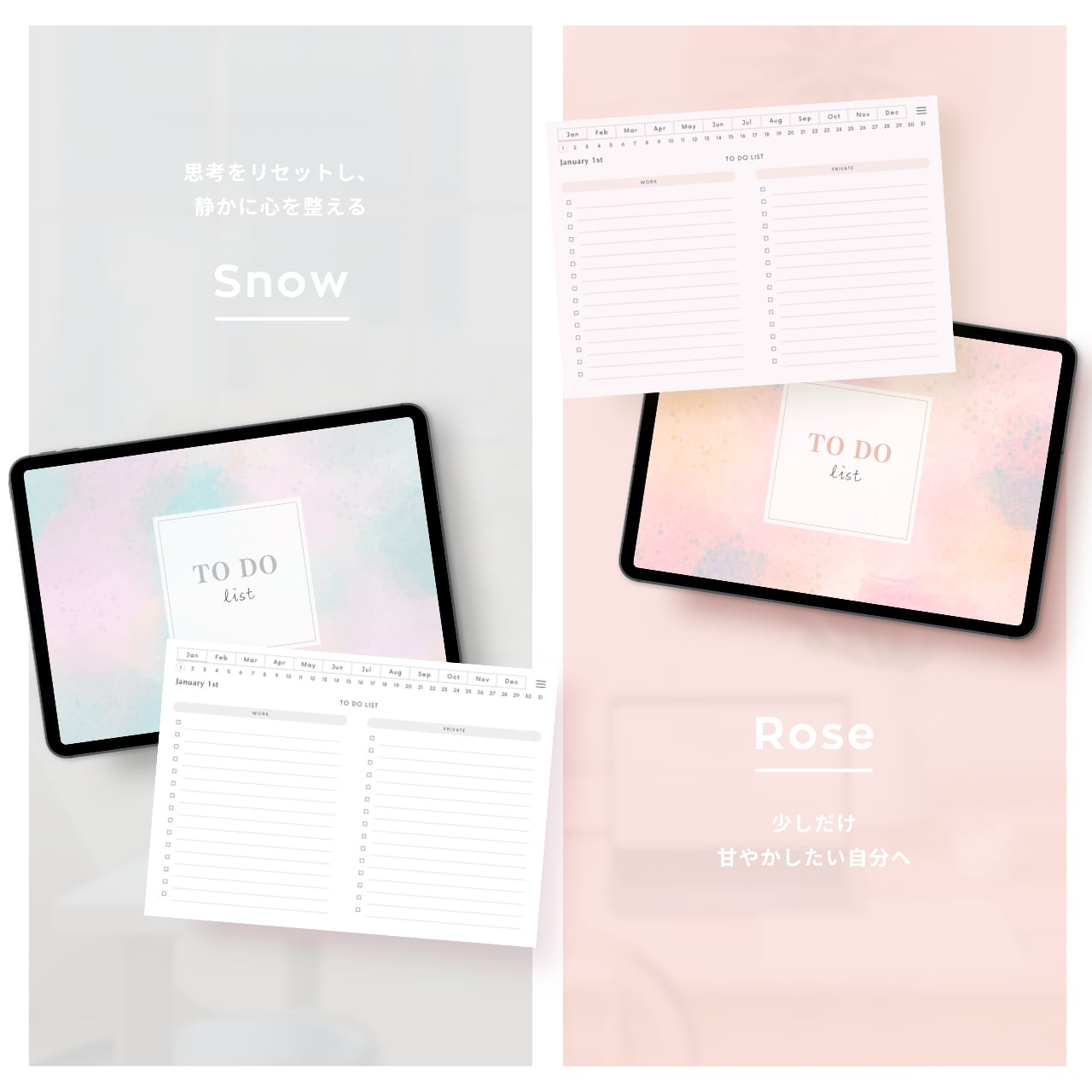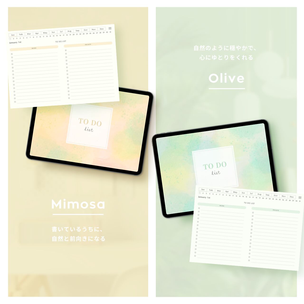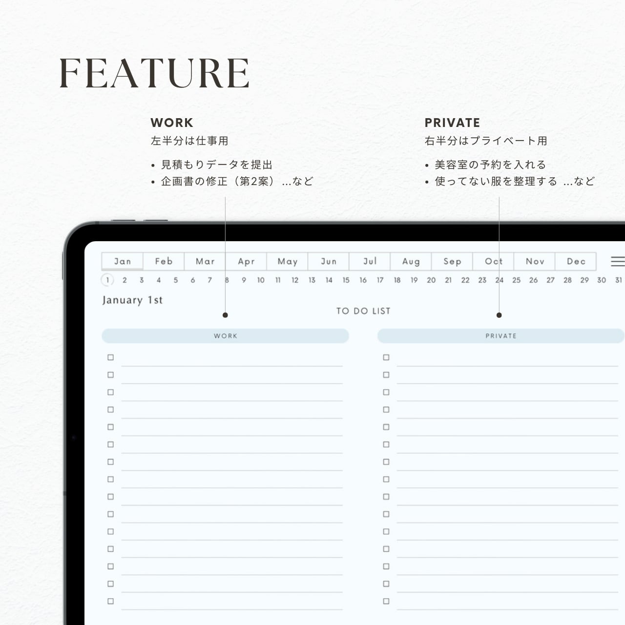 ・毎日のToDoリストページには、仕事とプライベート、それぞれのタスクを書き分けられるスペースがあります。