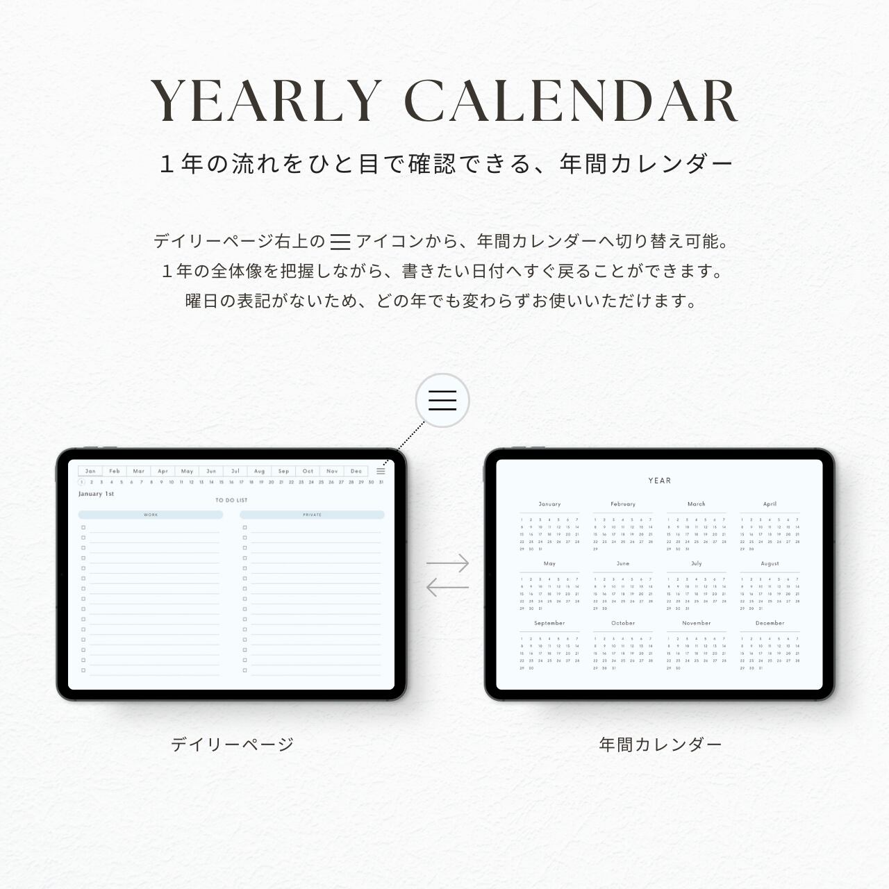 ・曜日の記載がないデザインのため、どの年でも変わらずお使いいただけます。