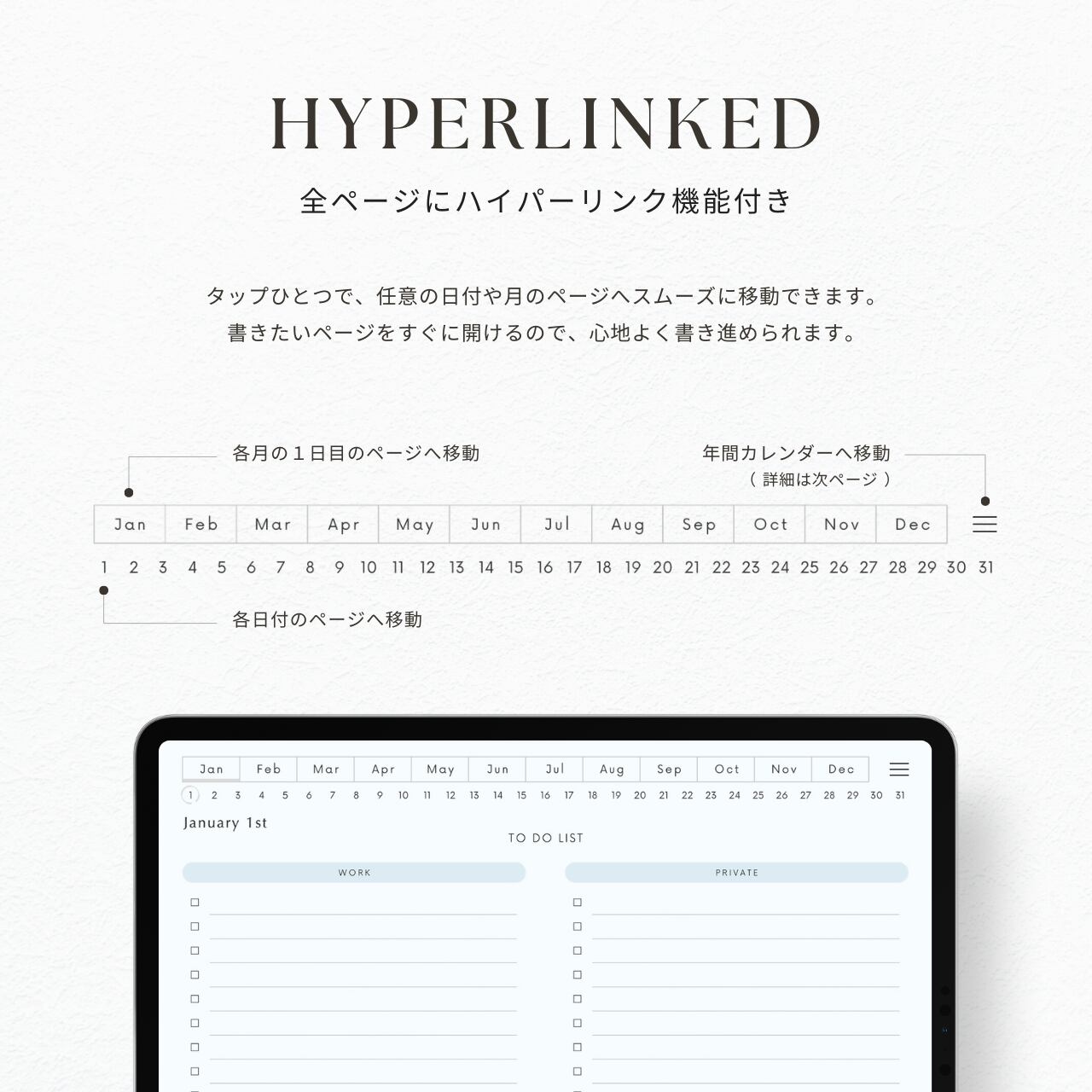 ・書きたい日付にすぐ移動できる、便利なハイパーリンク付きです。