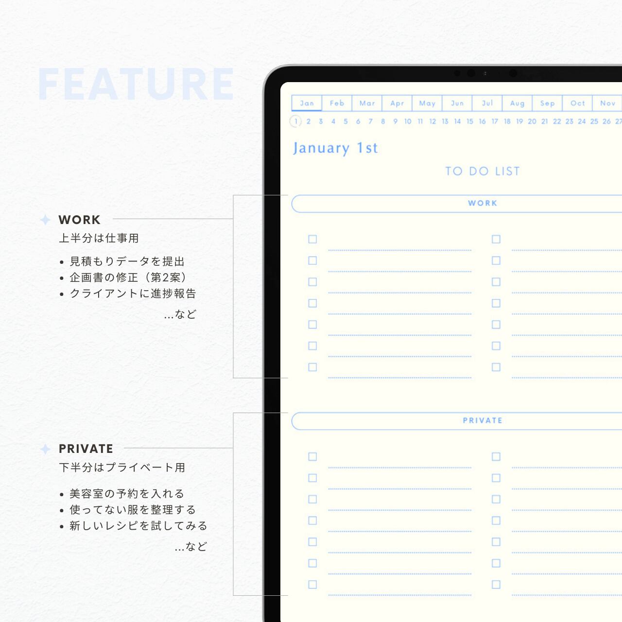 ・毎日のToDoリストページには、仕事とプライベート、それぞれのタスクを書き分けられるスペースがあります。