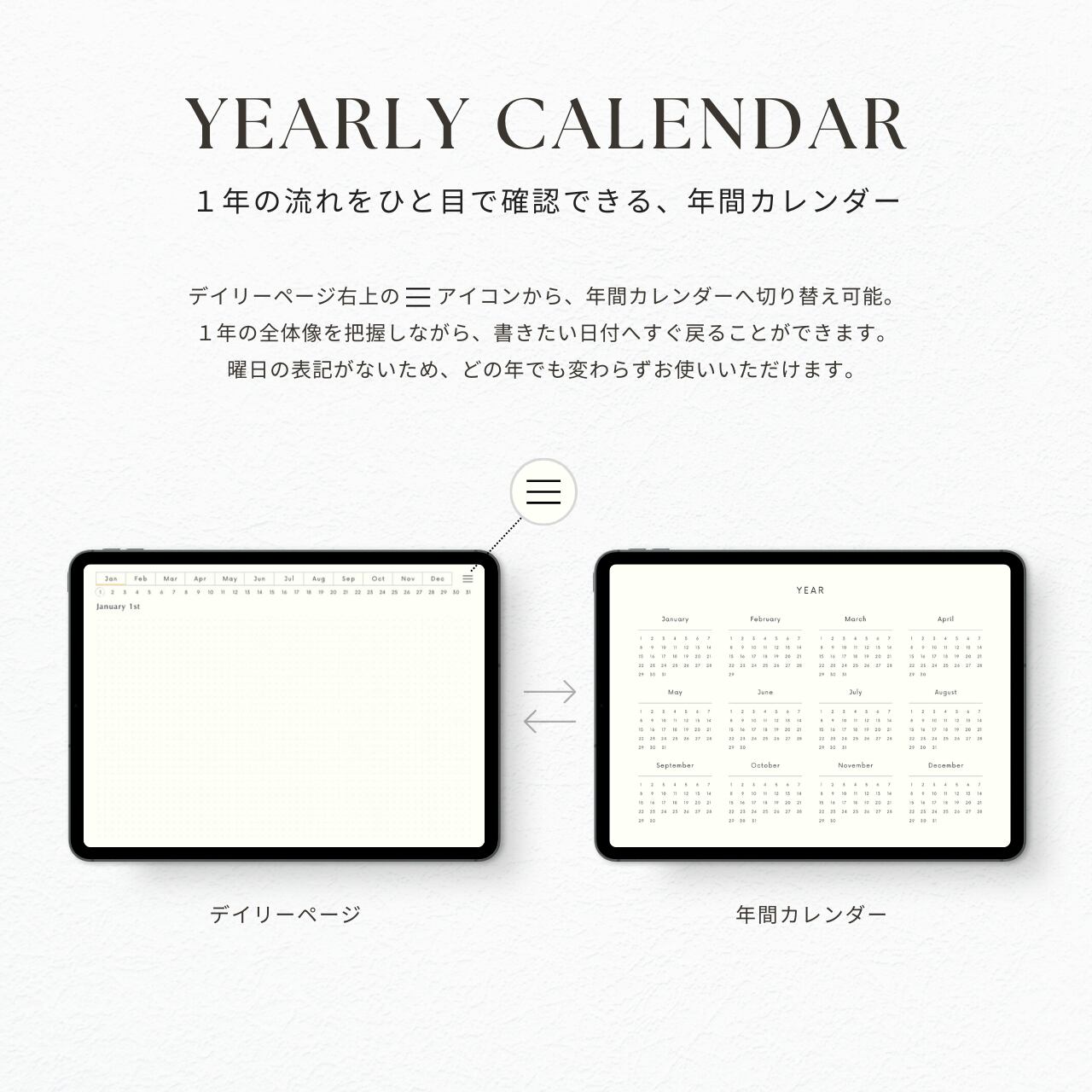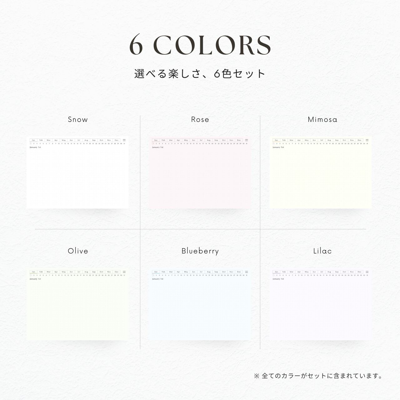 ・曜日の記載がないデザインのため、どの年でも変わらずお使いいただけます。