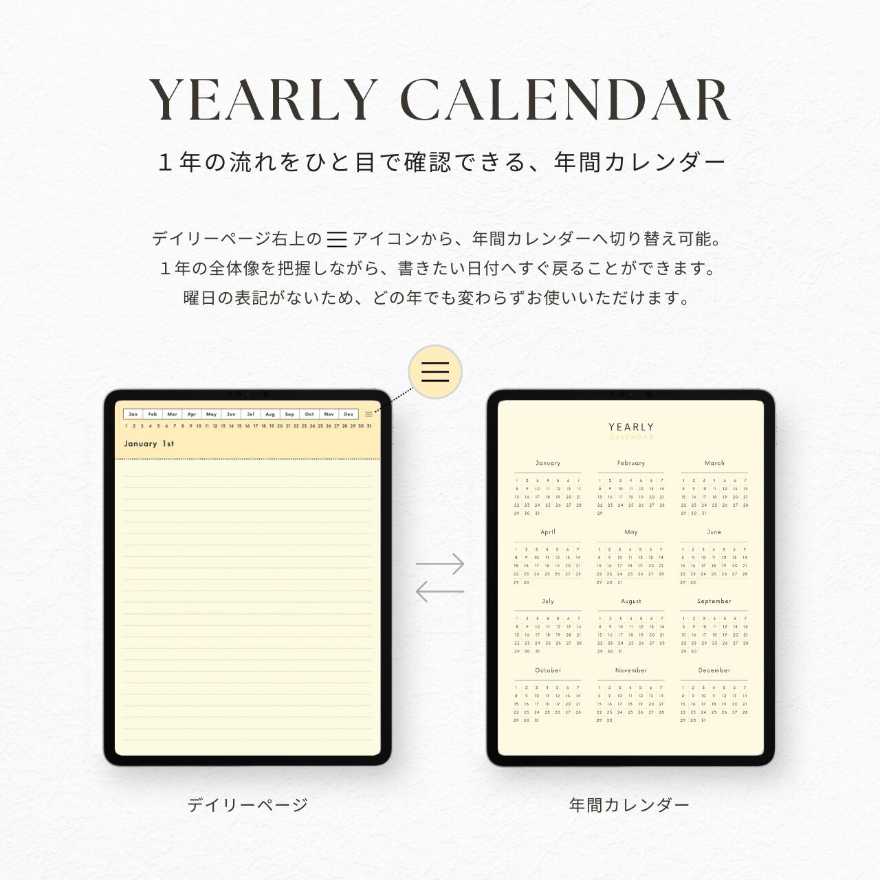 ・曜日の記載がないデザインのため、どの年でも変わらずお使いいただけます。