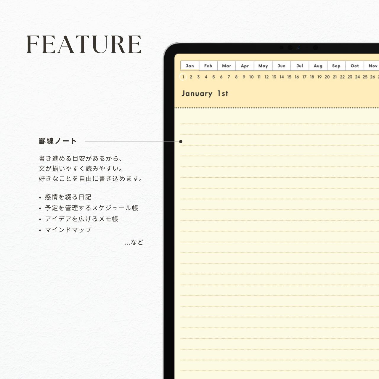 アイデアメモやToDoリスト、日記や目標ノートなど、使い方は自由自在。