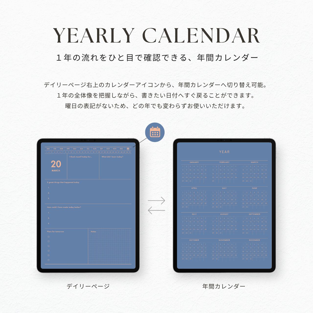 ・曜日の記載がないデザインのため、どの年でも変わらずお使いいただけます。